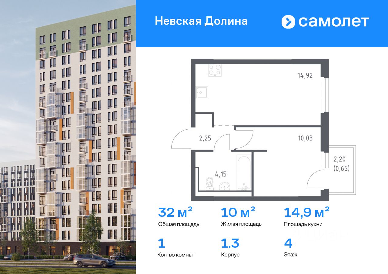 Строим кварталы для жизни с заботой о будущем. Предлагается 1-комнатная квартира комфорт-класса 32,01 кв.м в корпусе 1.3 на 4 этаже, в ЖК "Невская Долина"