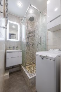 В кухне и санузле установлены теплые полы, новая мебель и техника, фильтры жесткой очистки, заменили полностью все коммуникации. Делали ремонт для себя, использовали дорогие и качественные материалы и технику.