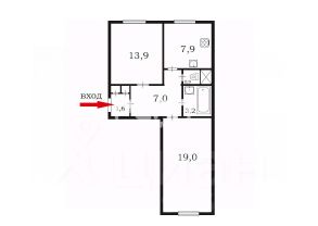 При входе тамбур (1,3 кв.м), 2 встроенных шкафа, далее большая прихожая, 7 кв.м. Комнаты изолированные 19 и 13,9 кв.м. Высокие потолки, 3 метра. Кухня 7,9 кв.м, хороший прямоугольник, довольно просторная. Ванная комната 3,2 кв.м. Везде отличное состояние, см.фото.