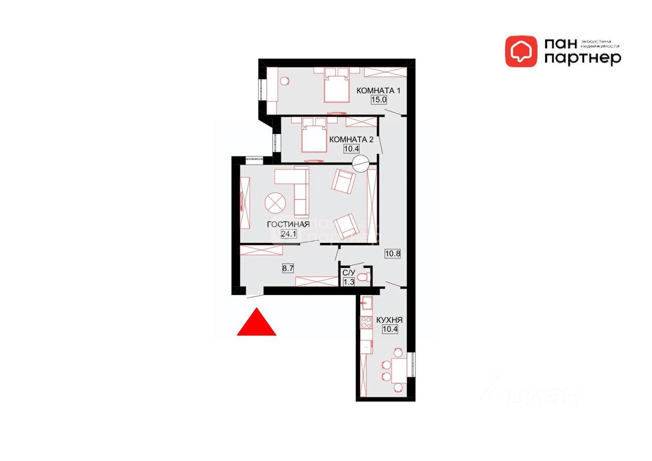 - Жилая площадь 49,5: три изолированные комнаты по 24,1; 10.4 и 15 кв м