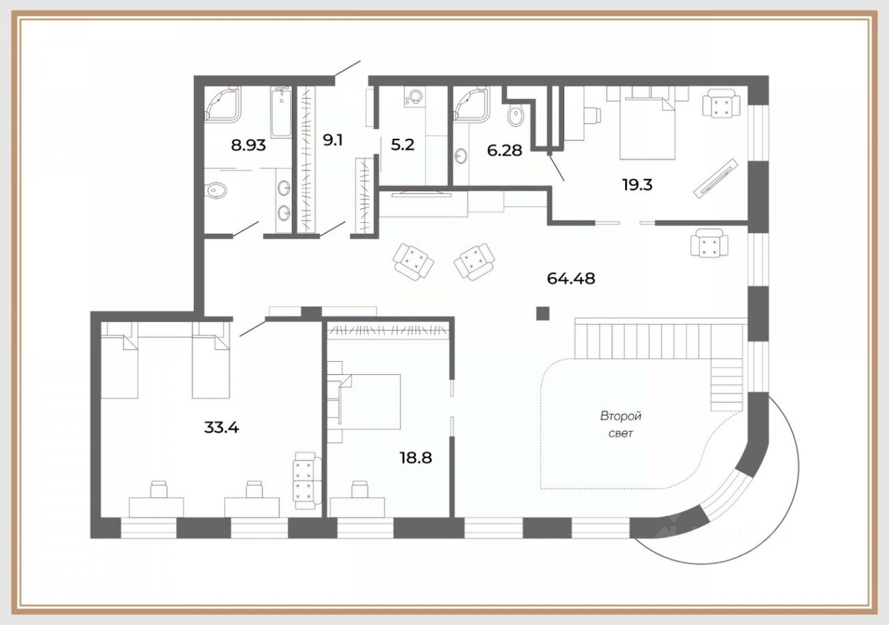 — Зона с живым камином, где приятно проводить вечера. Свой камин — преимущество большого города, доступное немногим.