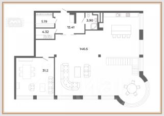 — Огромная кухня-гостиная площадью 140 м². Круглый стол для семейных ужинов находится в остеклённом эркере, а кулинарная зона спланирована специально для лёгкой готовки. Гостиная подходит для званых вечеров, много света и пространства.
