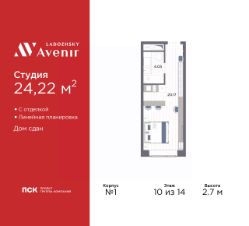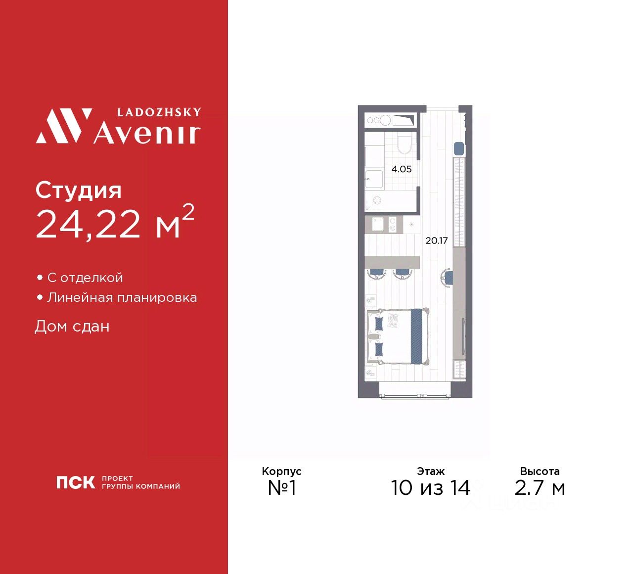 Продаются 1-комн. апартаменты-студия с отделкой в ЖК "Ladozhsky AVENIR" на 10 этаже. Общая площадь: 24.22 кв.м., площадь гостиной 20.16 кв.м., из которых 5 кв.м. выделено под кухонную зону. Все окна выходят на одну сторону. В апартаментах один совмещенный санузел. Высота потолков 2.7 м.