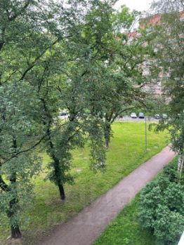 Окна выходят на обратную сторону дома. Очень зеленый двор с двух сторон дома.