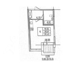 Общий метраж квартиры 28,61 м2 плюс балкон 2,8 м2.