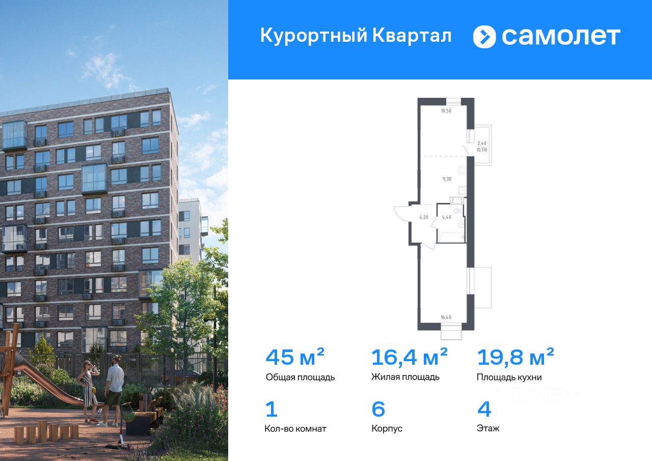 Строим кварталы для жизни с заботой о будущем. Предлагается 1-комнатная квартира комфорт-класса 45 кв.м в корпусе 6 на 4 этаже, в ЖК "Курортный Квартал"