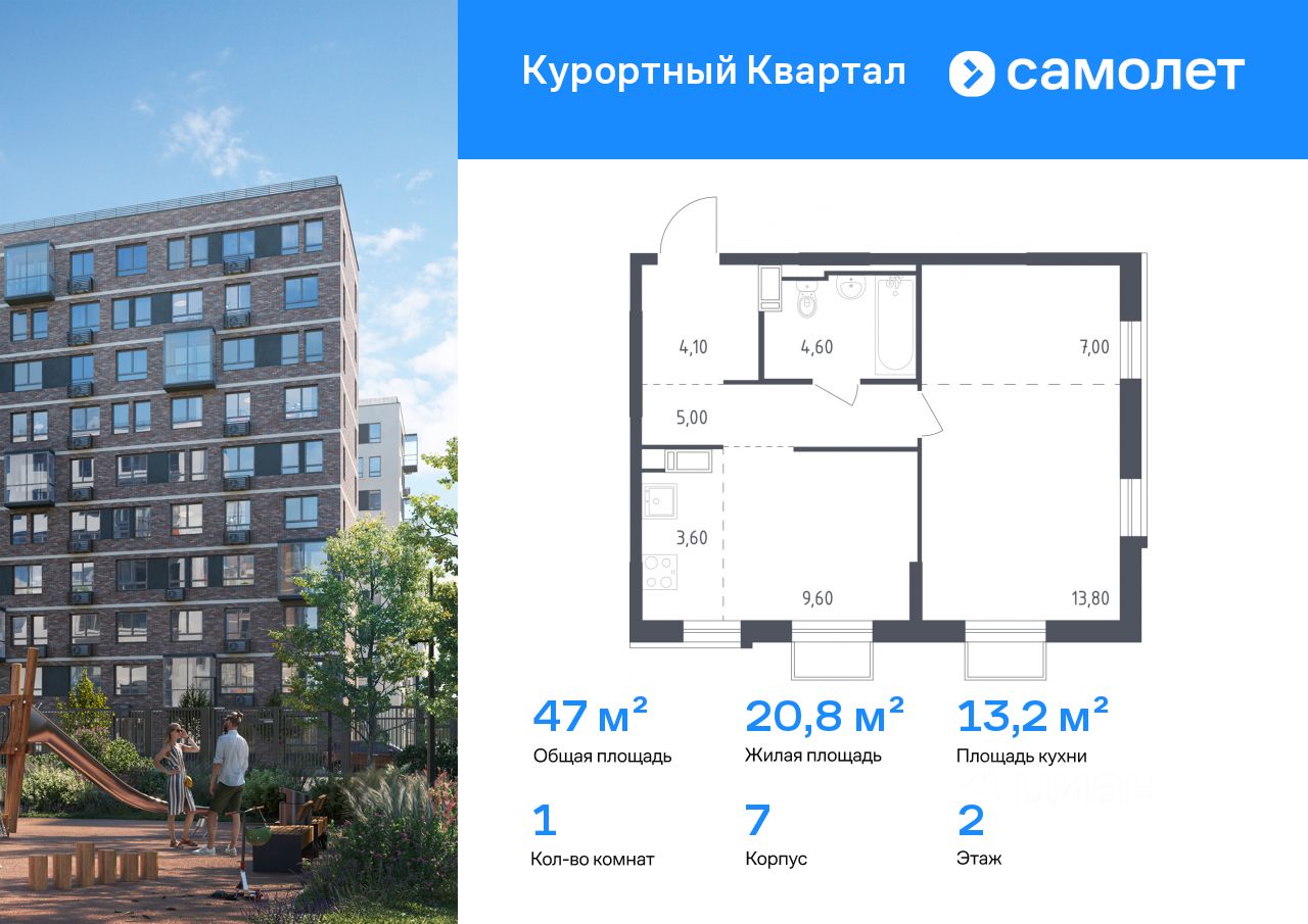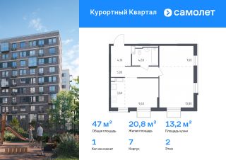 Строим кварталы для жизни с заботой о будущем. Предлагается 1-комнатная квартира комфорт-класса 47 кв.м в корпусе 7 на 2 этаже, в ЖК "Курортный Квартал"