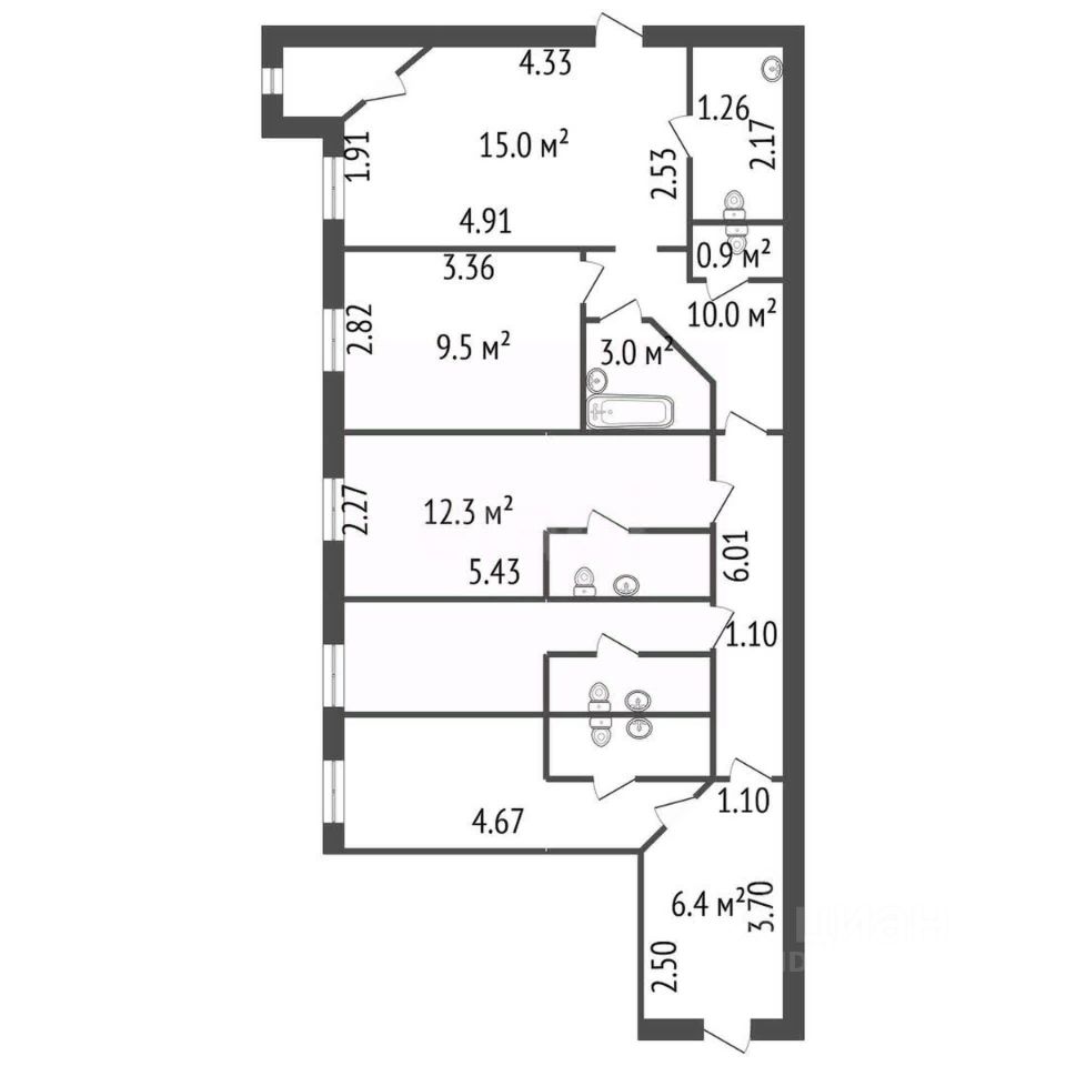 В квартире уже сделаны дополнительные стены, и сан-узлы в каждом помещении, с душевой и выводом под унитаз, не требующие дополнительных резрешений (квартира расположена на 1м этаже).