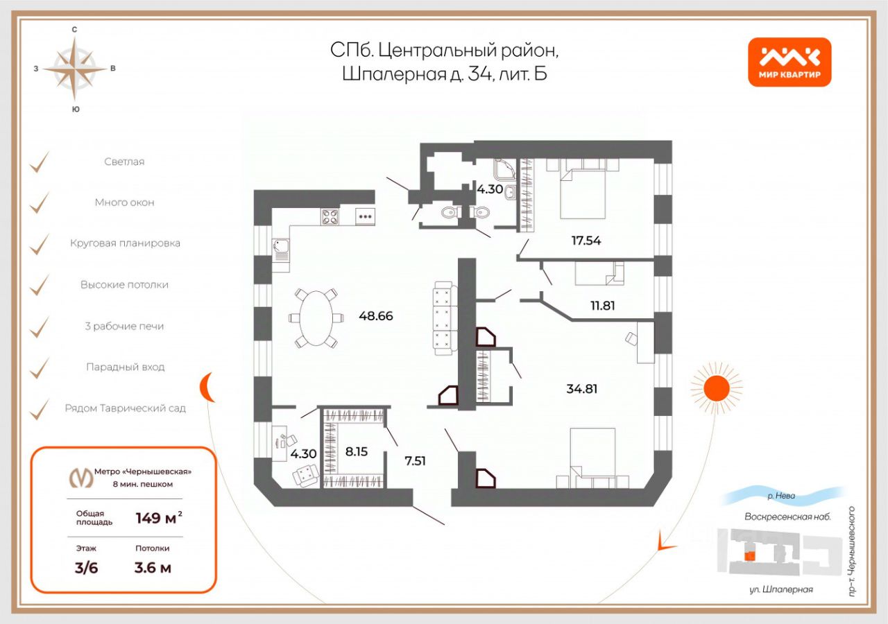 Арт. 107419687 Предлагаем Вашему вниманию квартиру с 3-мя спальнями, с парадным входом, в исторической части Санкт Петербурга.