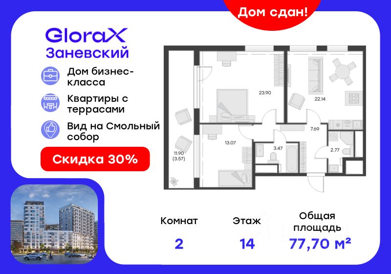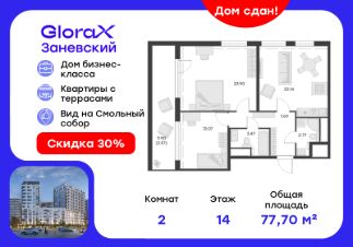 Продается 2-комн. квартира на 14-м этаже в проекте бизнес-класса GloraX Заневский. Общая площадь лота составляет 76,61 кв. м, из которых 36,97 кв. м отведено под жилую и 22,14 кв. м под кухонную зону. Номер квартиры - 370.