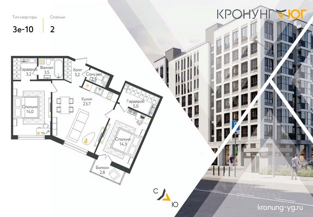 Продаётся 2-комнатная квартира в строящемся доме (Дом 1), срок сдачи: I-кв. 2027, общей площадью 69.1 кв.м., на 5 этаже. Кронунг ЮГ - жилой дом комфорт-класса в тихом уютном районе на берегу реки Дудергофки. Невысокая этажность, современная архитектура, закрытый двор с площадками для игр и отдыха.