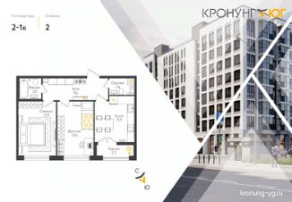 Продаётся 2-комнатная квартира в строящемся доме (Дом 1), срок сдачи: I-кв. 2027, общей площадью 56.8 кв.м., на 6 этаже. Кронунг ЮГ - жилой дом комфорт-класса в тихом уютном районе на берегу реки Дудергофки. Невысокая этажность, современная архитектура, закрытый двор с площадками для игр и отдыха.