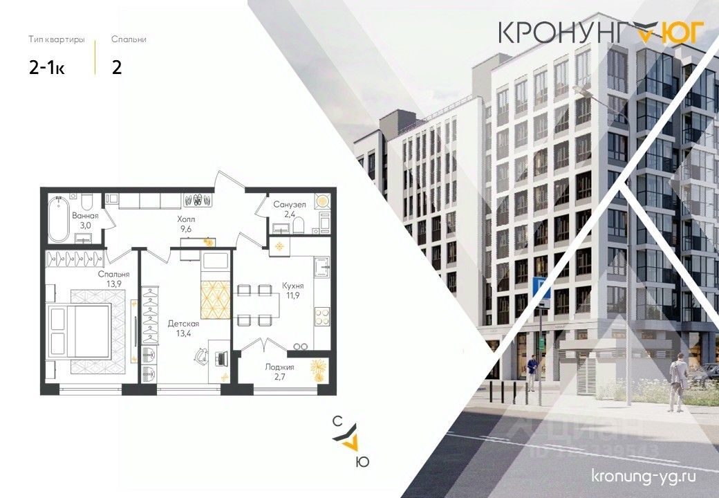 Продаётся 2-комнатная квартира в строящемся доме (Дом 1), срок сдачи: I-кв. 2027, общей площадью 56.3 кв.м., на 4 этаже. Кронунг ЮГ - жилой дом комфорт-класса в тихом уютном районе на берегу реки Дудергофки. Невысокая этажность, современная архитектура, закрытый двор с площадками для игр и отдыха.