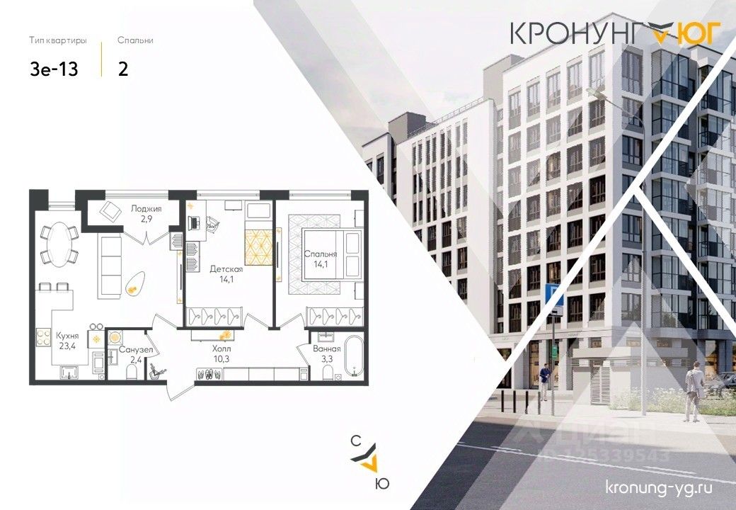 Продаётся 2-комнатная квартира в строящемся доме (Дом 1), срок сдачи: I-кв. 2027, общей площадью 69.1 кв.м., на 5 этаже. Кронунг ЮГ - жилой дом комфорт-класса в тихом уютном районе на берегу реки Дудергофки. Невысокая этажность, современная архитектура, закрытый двор с площадками для игр и отдыха.