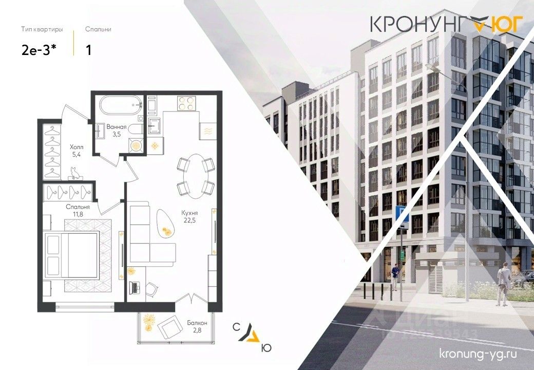 Продаётся 1-комнатная квартира в строящемся доме (Дом 1), срок сдачи: I-кв. 2027, общей площадью 44.9 кв.м., на 5 этаже. Кронунг ЮГ - жилой дом комфорт-класса в тихом уютном районе на берегу реки Дудергофки. Невысокая этажность, современная архитектура, закрытый двор с площадками для игр и отдыха.