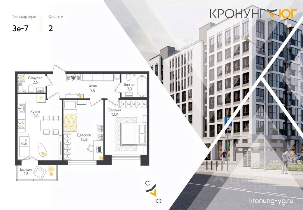 Продаётся 2-комнатная квартира в строящемся доме (Дом 1), срок сдачи: I-кв. 2027, общей площадью 60 кв.м., на 5 этаже. Кронунг ЮГ - жилой дом комфорт-класса в тихом уютном районе на берегу реки Дудергофки. Невысокая этажность, современная архитектура, закрытый двор с площадками для игр и отдыха.