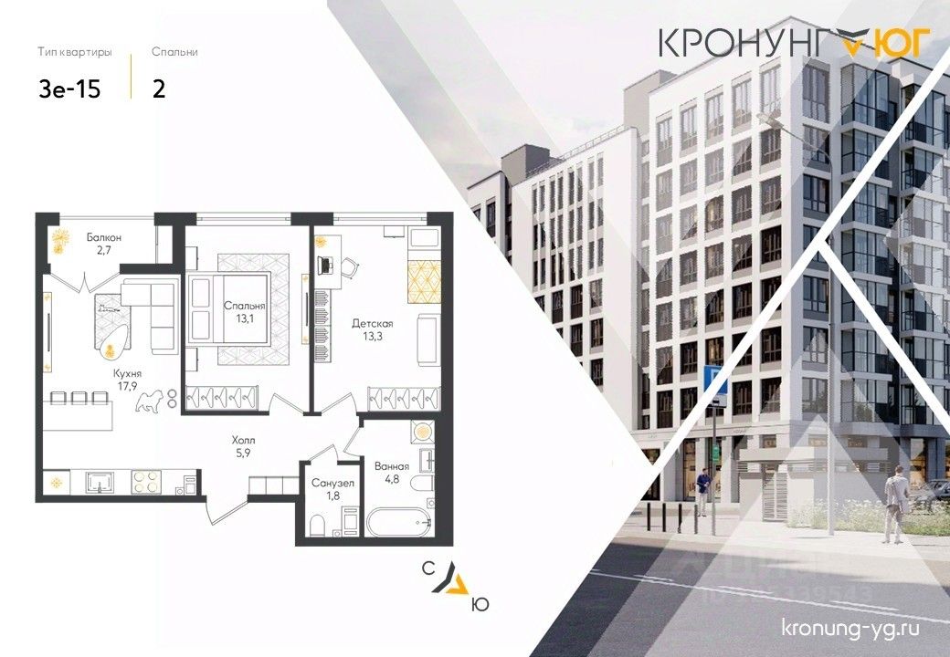 Продаётся 2-комнатная квартира в строящемся доме (Дом 1), срок сдачи: I-кв. 2027, общей площадью 58.6 кв.м., на 2 этаже. Кронунг ЮГ - жилой дом комфорт-класса в тихом уютном районе на берегу реки Дудергофки. Невысокая этажность, современная архитектура, закрытый двор с площадками для игр и отдыха.