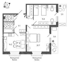 Спальня 20,7 м2 с двумя панорамными окнами и балконом, вторая комната 15,8м2 также с балконом, раздельный санузел.