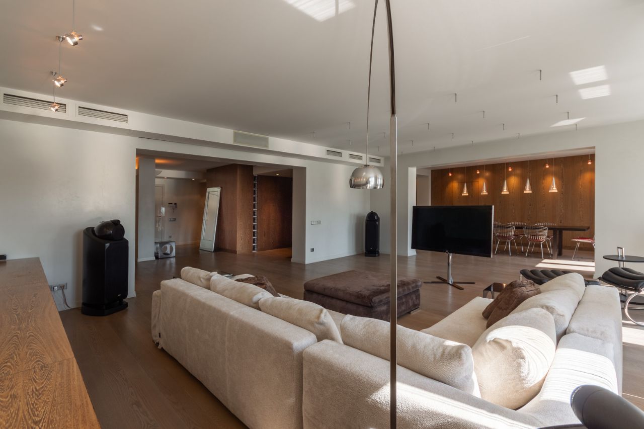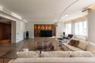 Большая гостиная (45.5 кв м)- сердце квартиры - с шикарной мебелью Minotti, Alivar, B&B, с акустической 5.1 системой B&W, телевизором LOEWE, проектором для просмотров кинофильмов.