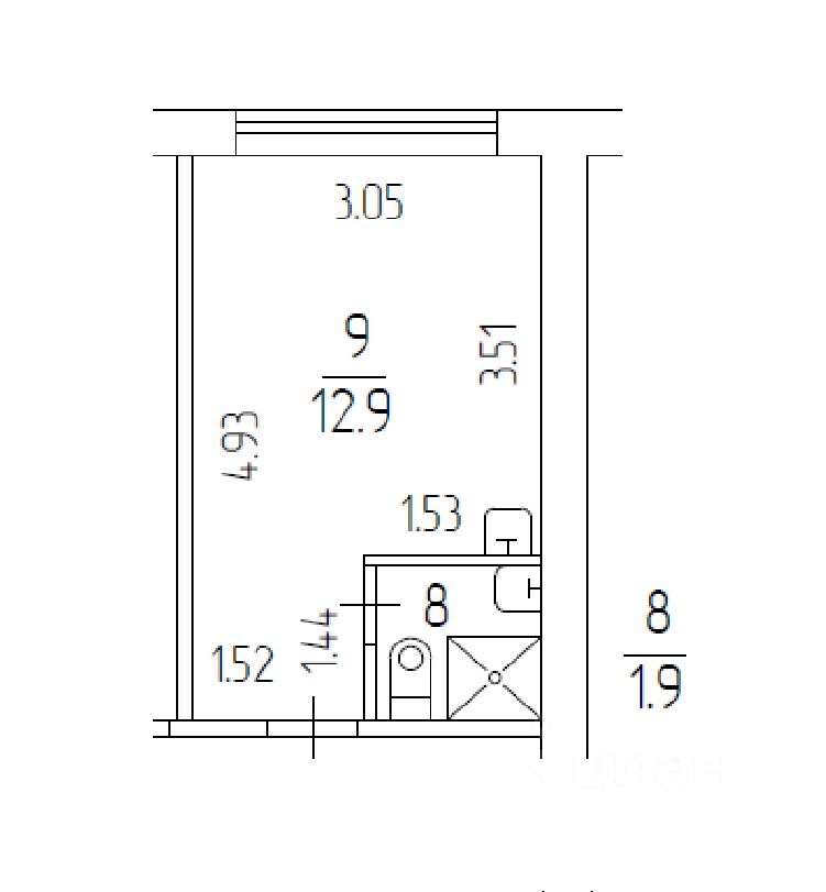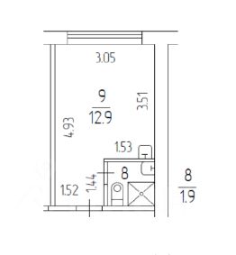 Студия площадью 15,0 кв.м, см. план. Окно со стеклопакетом смотрит в тихий, очень зеленый двор. В студии оборудован совмещенный санузел, место под кухню.