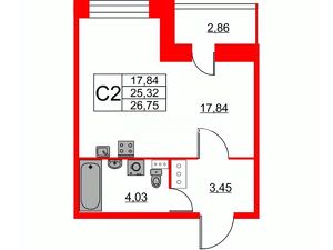 - Площадь: 25,1 кв. м (жилая - 17,84 кв. м).