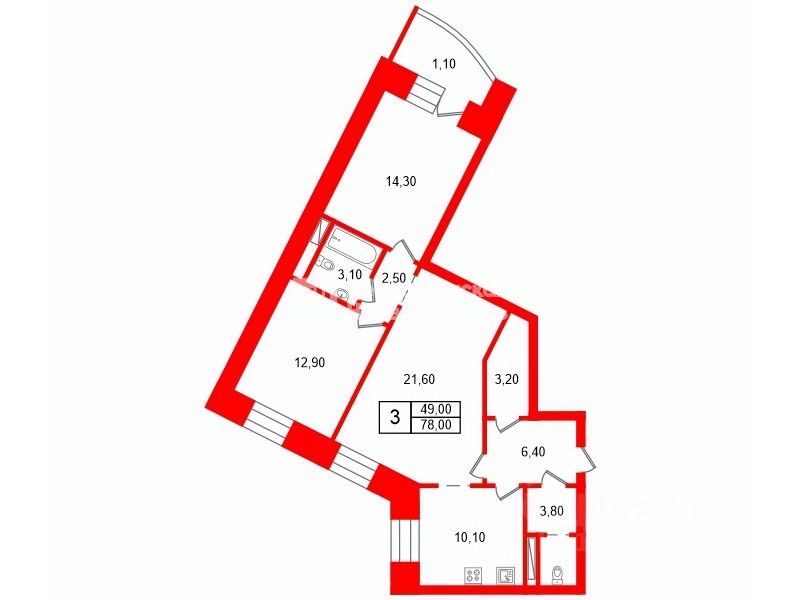 Большая комната-гостиная 21,6м2 граничит с кухней, и две изолированные комнаты по 14,3м2 и 12,9м2 соответственно.