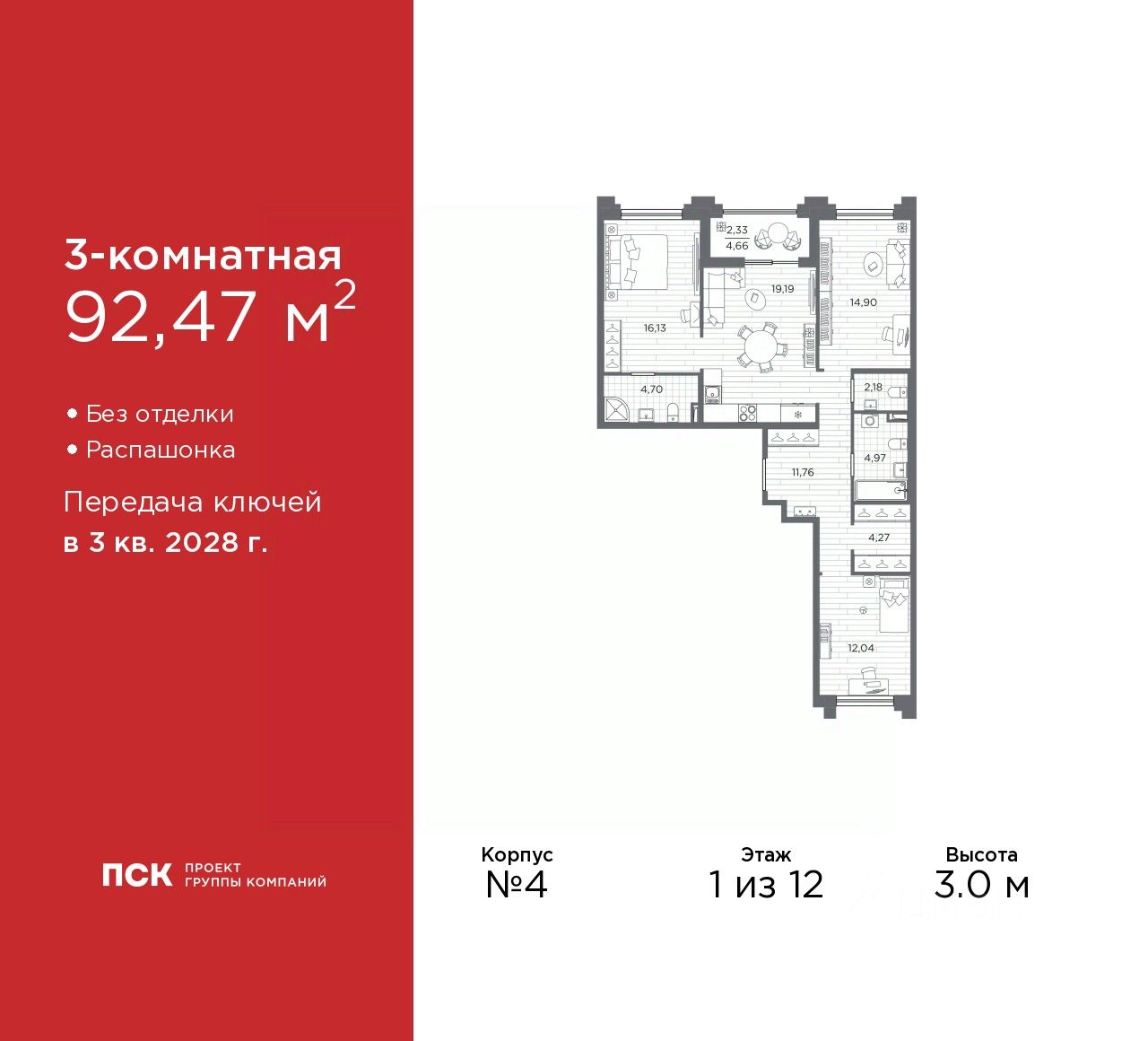3-комн. квартира в Клубный квартал "Ассамблея" на 1 этаже. Квартира без отделки, полностью готова к ремонту. Общая площадь: 92.47 кв.м., жилая: 43.07 кв.м., площадь просторной кухни-столовой: 19.19 кв.м. Квартира - распашонка, без проходных комнат, окна выходят на paзные стороны дома. В квартире одна лоджия, два совмещенных и один раздельный санузел. Высота потолков 3.0 м.