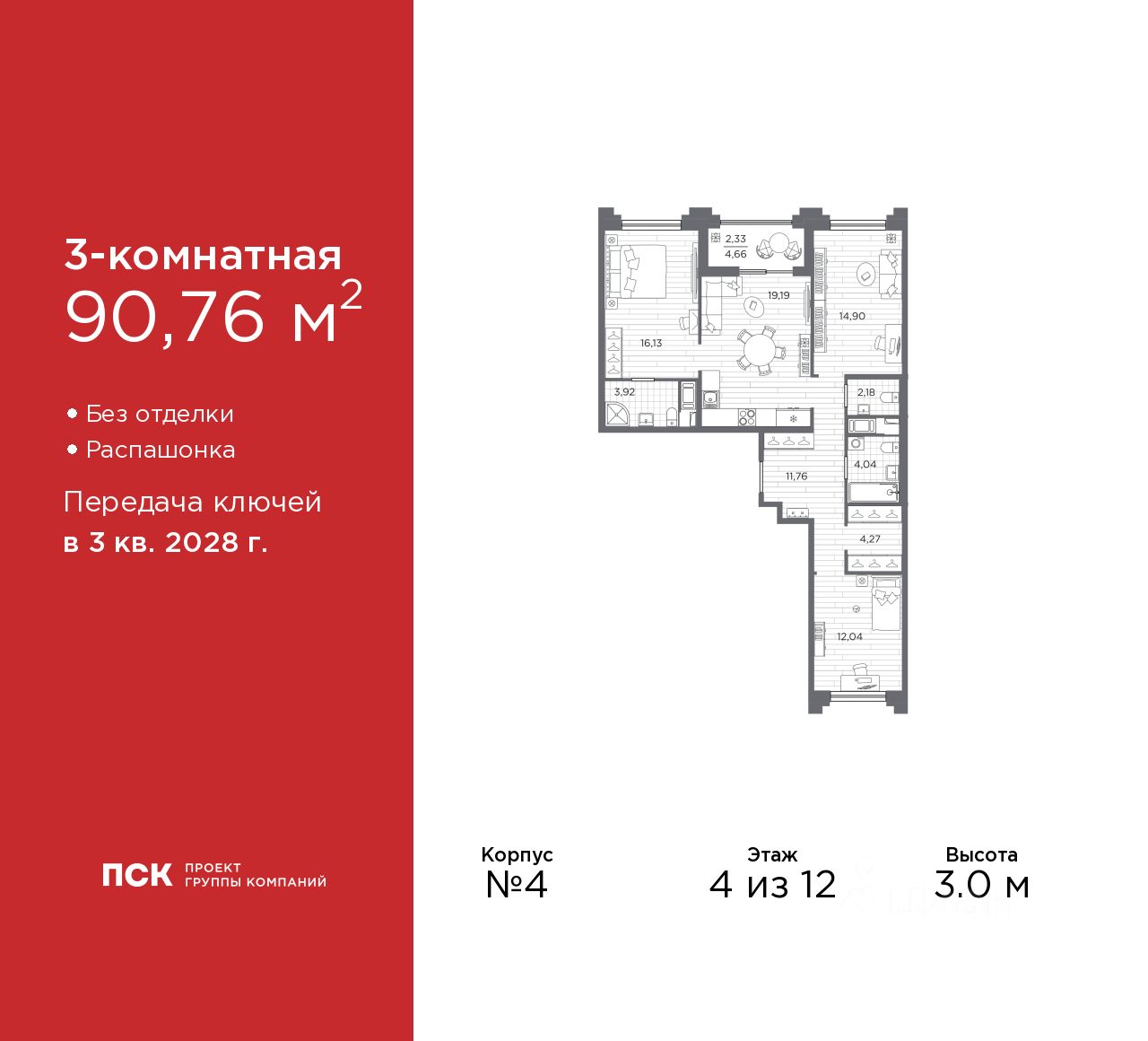 Продается трехкомнатная квартира в Клубный квартал "Ассамблея" на 4 этаже. Квартира без отделки, полностью готова к чистовой отделке и дальнейшему ремонту. Общая площадь: 90.76 кв.м., жилая: 43.07 кв.м., площадь просторной кухни-столовой: 19.19 кв.м. Квартира - распашонка, без проходных комнат, окна выходят на paзные стороны дома. В квартире одна лоджия, два совмещенных и один раздельный санузел. Высота потолков 3.0 м.