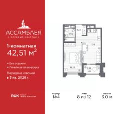 Просторная однокомнатная квартира в Клубный квартал "Ассамблея" на 8 этаже. Квартира без отделки, после оформления собственности можно делать ремонт. Общая площадь: 42.51 кв.м., жилая: 15.23 кв.м., площадь просторной кухни-столовой: 17.14 кв.м. Все окна выходят на одну сторону. В квартире одна лоджия, один совмещенный санузел. Высота потолков 3.0 м.