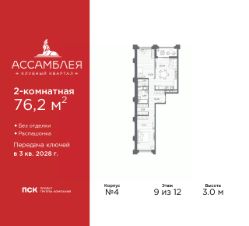 Двухкомнатная квартира от застройщика в Клубный квартал "Ассамблея" на 9 этаже. Квартира без отделки, после оформления собственности можно делать ремонт. Общая площадь: 76.2 кв.м., жилая: 32.8 кв.м., площадь просторной кухни-столовой: 20.59 кв.м. Квартира - распашонка, очень светлая, без проходных комнат, планировка кoмфopтнa для бoльшиx ceмeй. В квартире одна лоджия, один совмещенный и один раздельный санузел. Высота потолков 3.0 м.