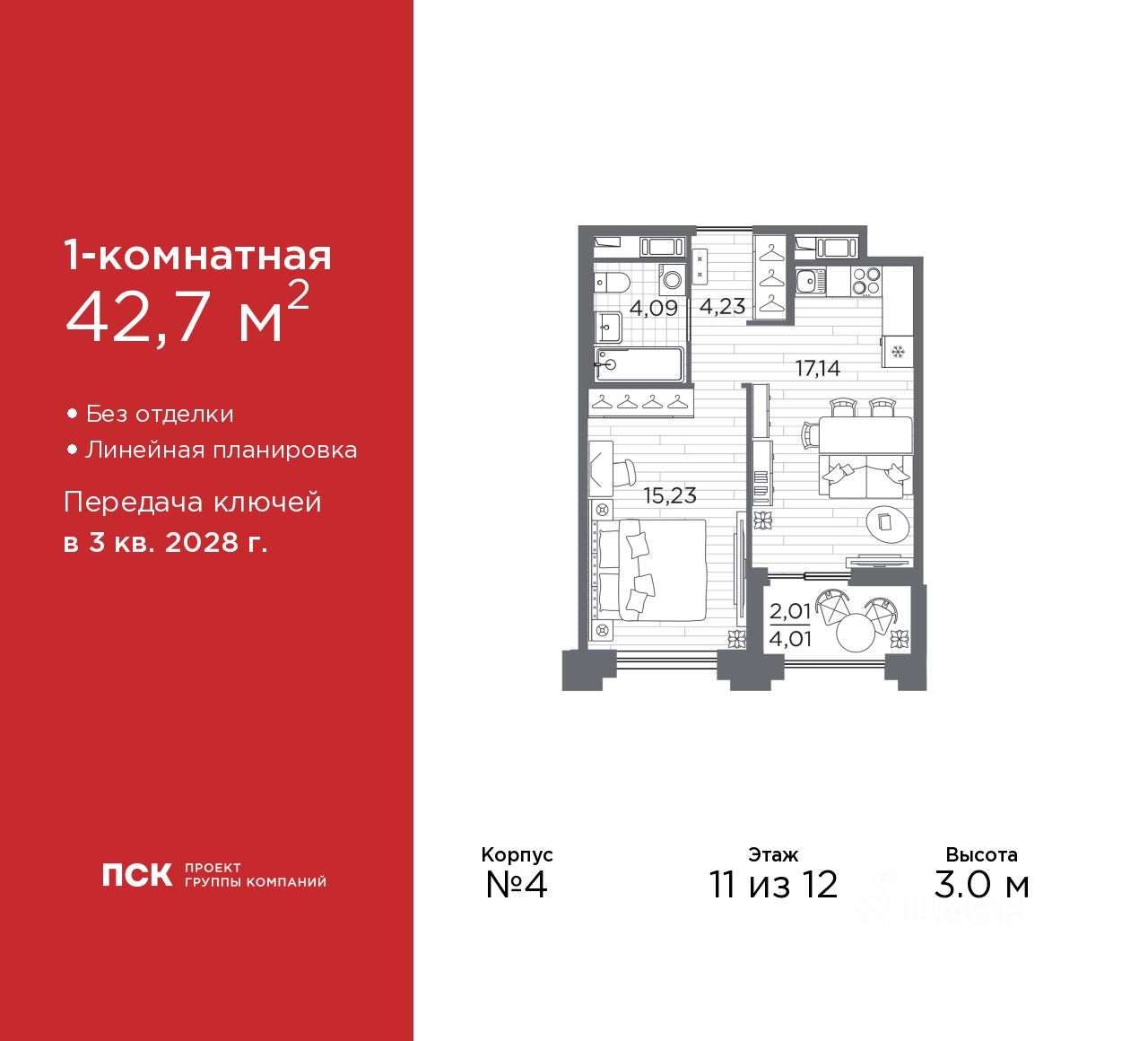 Однокомнатная квартира от застройщика в Клубный квартал "Ассамблея" на 11 этаже. Квартира без отделки, после оформления собственности можно делать ремонт. Общая площадь: 42.7 кв.м., жилая: 15.23 кв.м., площадь просторной кухни-столовой: 17.14 кв.м. Все окна выходят на одну сторону. В квартире одна лоджия, один совмещенный санузел. Высота потолков 3.0 м.