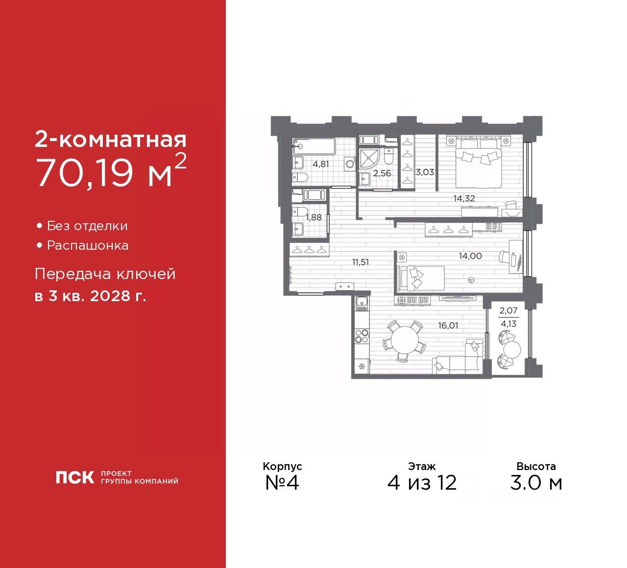 Дом монолитный, трехподъездный, высотой 12 этажей. Квартира находится во 2-й секции в корпусе 4. На этаже 7 квартир. В подъезде 1 пассажирский и 1 грузовой лифт. Начало строительства - 3 квартал 2025 года. Окончание строительства - 3 квартал 2028 года. Оформление сделки по договору долевого участия.