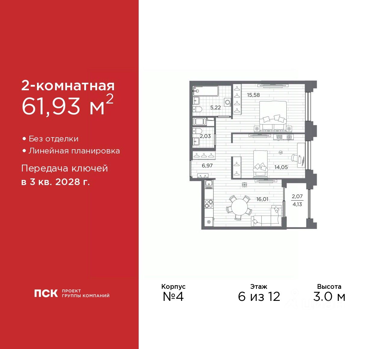Просторная 2-комн. квартира в Клубный квартал "Ассамблея" на 6 этаже. Квартира без отделки, полностью готова к чистовой отделке и дальнейшему ремонту. Общая площадь: 61.93 кв.м., жилая: 29.63 кв.м., площадь просторной кухни-столовой: 16.01 кв.м. Комнаты изолированные, все окна выходят на одну сторону. В квартире одна лоджия, один совмещенный и один раздельный санузел. Высота потолков 3.0 м.