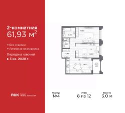 Просторная 2-комн. квартира в Клубный квартал "Ассамблея" на 8 этаже. Квартира без отделки, после оформления собственности можно делать ремонт. Общая площадь: 61.93 кв.м., жилая: 29.63 кв.м., площадь просторной кухни-столовой: 16.01 кв.м. Комнаты изолированные, все окна выходят на одну сторону. В квартире одна лоджия, один совмещенный и один раздельный санузел. Высота потолков 3.0 м.