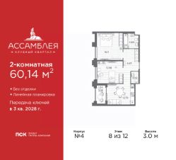 Продается 2-комн. квартира от застройщика в Клубный квартал "Ассамблея" на 8 этаже. Квартира без отделки, после оформления собственности можно делать ремонт. Общая площадь: 60.14 кв.м., жилая: 29.07 кв.м., площадь просторной кухни-столовой: 12.79 кв.м. Комнаты изолированные, все окна выходят на одну сторону. В квартире одна лоджия, один совмещенный и один раздельный санузел. Высота потолков 3.0 м.