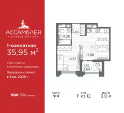 Однокомнатная квартира в Клубный квартал "Ассамблея" на 11 этаже. Квартира без отделки, после оформления собственности можно делать ремонт. Общая площадь: 35.95 кв.м., жилая: 10.37 кв.м., площадь просторной кухни-столовой: 15.68 кв.м. Все окна выходят на одну сторону. В квартире одна лоджия, один совмещенный санузел. Высота потолков 3.0 м.