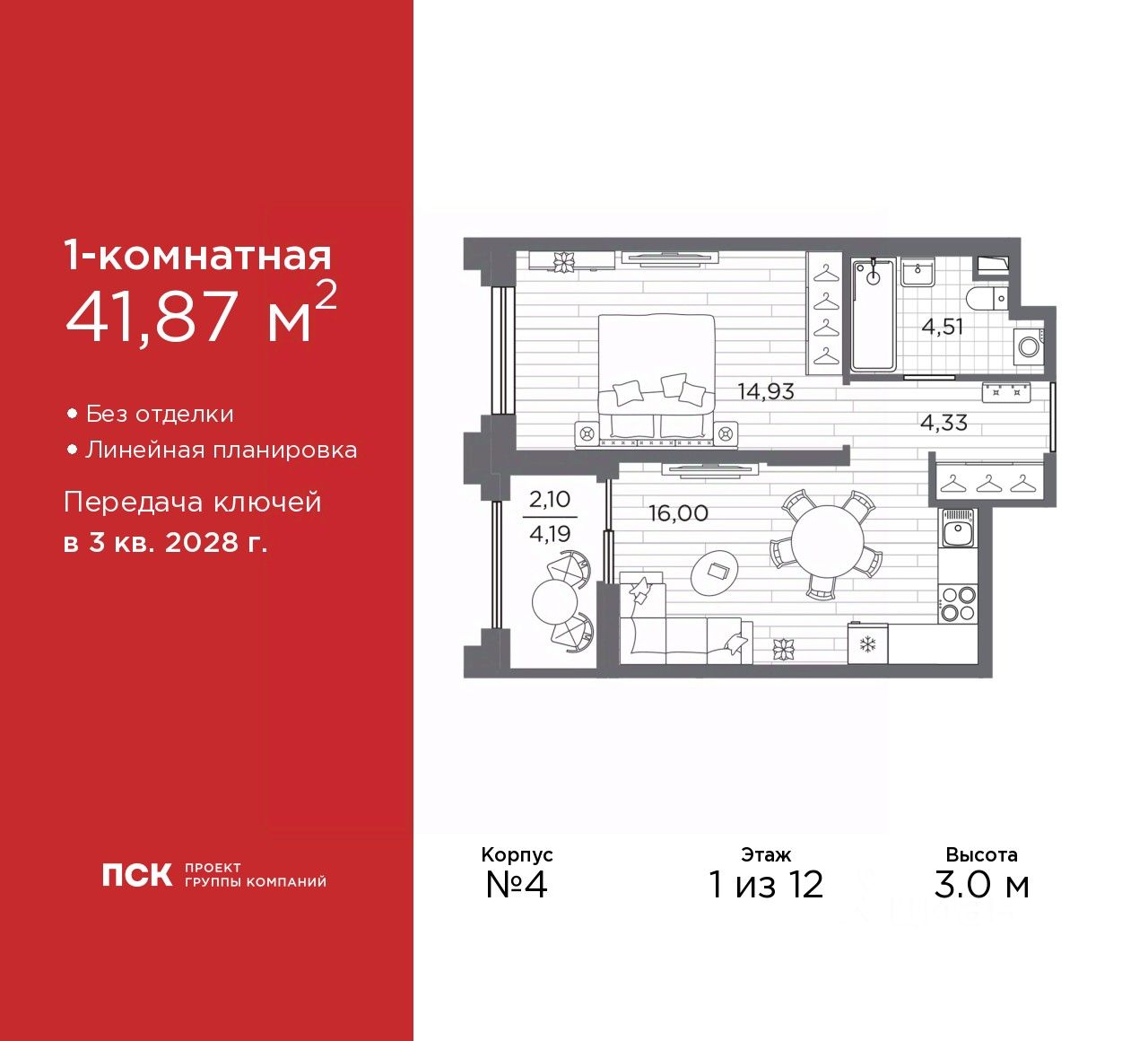 Дом монолитный, трехподъездный, высотой 12 этажей. Квартира находится в 3-й секции в корпусе 4. На этаже 9 квартир. В подъезде 1 пассажирский и 1 грузовой лифт. Начало строительства - 3 квартал 2025 года. Окончание строительства - 3 квартал 2028 года. Оформление сделки по договору долевого участия.