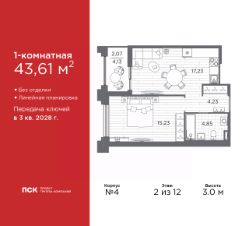 Однокомнатная квартира от застройщика в Клубный квартал "Ассамблея" на 2 этаже. Квартира без отделки, новый собственник может сделать ремонт по индивидуальному проекту. Общая площадь: 43.61 кв.м., жилая: 15.23 кв.м., площадь просторной кухни-столовой: 17.23 кв.м. Все окна выходят на одну сторону. В квартире одна лоджия, один совмещенный санузел. Высота потолков 3.0 м.