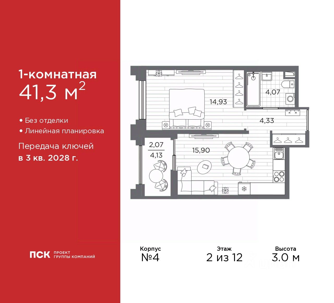 1-комн. квартира в Клубный квартал "Ассамблея" на 2 этаже. Квартира без отделки, после выдачи ключей можно делать ремонт. Общая площадь: 41.3 кв.м., жилая: 14.93 кв.м., площадь просторной кухни-столовой: 15.9 кв.м. Все окна выходят на одну сторону. В квартире одна лоджия, один совмещенный санузел. Высота потолков 3.0 м.