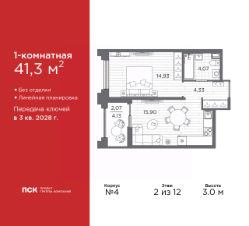 Дом монолитный, трехподъездный, высотой 12 этажей. Квартира находится в 3-й секции в корпусе 4. На этаже 9 квартир. В подъезде 1 пассажирский и 1 грузовой лифт. Начало строительства - 3 квартал 2025 года. Окончание строительства - 3 квартал 2028 года. Оформление сделки по договору долевого участия.