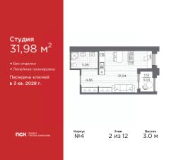 Однокомнатная квартира-студия в Клубный квартал "Ассамблея" на 2 этаже. Квартира без отделки, после выдачи ключей можно делать ремонт. Общая площадь: 31.98 кв.м., площадь гостиной 21.04 кв.м., из которых 5 кв.м. выделено под кухонную зону. Все окна выходят на одну сторону. В квартире одна лоджия, один совмещенный санузел. Высота потолков 3.0 м.