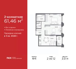 Продается двухкомнатная квартира от застройщика в Клубный квартал "Ассамблея" на 2 этаже. Квартира без отделки, полностью готова к чистовой отделке и дальнейшему ремонту. Общая площадь: 61.46 кв.м., жилая: 29.63 кв.м., площадь просторной кухни-столовой: 15.6 кв.м. Комнаты изолированные, все окна выходят на одну сторону. В квартире одна лоджия, один совмещенный и один раздельный санузел. Высота потолков 3.0 м.