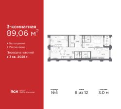 Продается трехкомнатная квартира в Клубный квартал "Ассамблея" на 6 этаже. Квартира без отделки, после получения ключей можно делать ремонт. Общая площадь: 89.06 кв.м., жилая: 42.34 кв.м., площадь просторной кухни-столовой: 19.97 кв.м. Квартира - распашонка, без проходных комнат, окна выходят на paзные стороны дома. В квартире одна лоджия, два совмещенных и один раздельный санузел. Высота потолков 3.0 м.