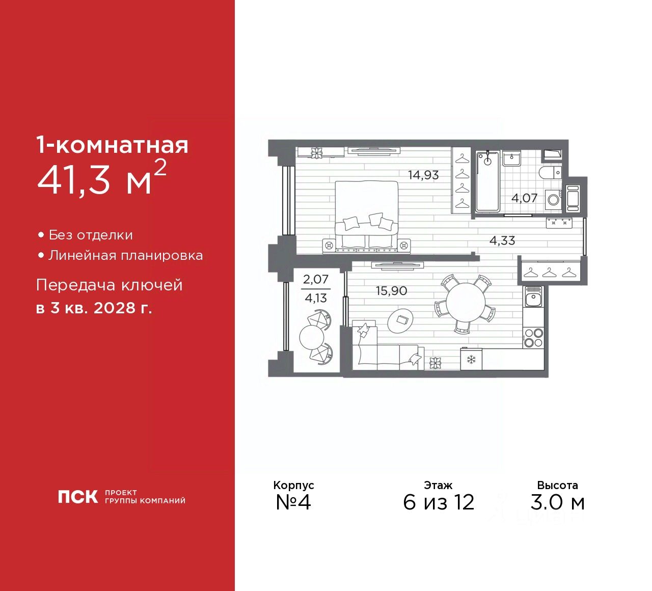Просторная однокомнатная квартира в Клубный квартал "Ассамблея" на 6 этаже. Квартира без отделки, новый собственник может сделать ремонт по своему проекту. Общая площадь: 41.3 кв.м., жилая: 14.93 кв.м., площадь просторной кухни-столовой: 15.9 кв.м. Все окна выходят на одну сторону. В квартире одна лоджия, один совмещенный санузел. Высота потолков 3.0 м.