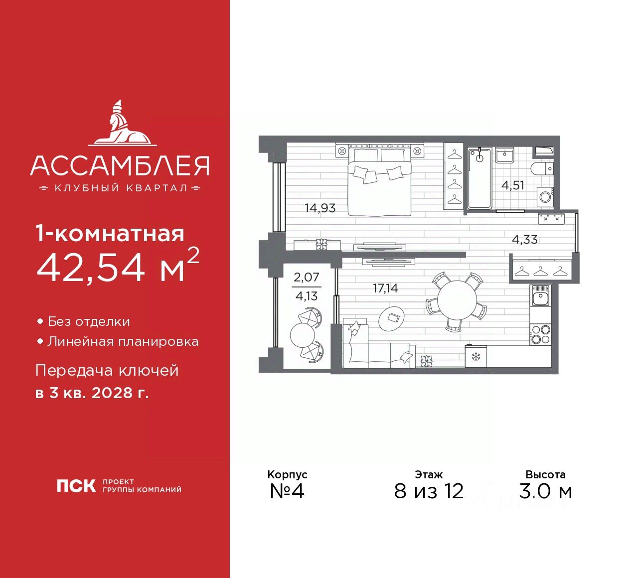 Однокомнатная квартира от застройщика в Клубный квартал "Ассамблея" на 8 этаже. Квартира без отделки, полностью готова к ремонту. Общая площадь: 42.54 кв.м., жилая: 14.93 кв.м., площадь просторной кухни-столовой: 17.14 кв.м. Все окна выходят на одну сторону. В квартире одна лоджия, один совмещенный санузел. Высота потолков 3.0 м.
