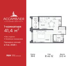 Продается однокомнатная квартира в Клубный квартал "Ассамблея" на 8 этаже. Квартира без отделки, полностью готова к ремонту. Общая площадь: 41.4 кв.м., жилая: 14.93 кв.м., площадь просторной кухни-столовой: 16 кв.м. Все окна выходят на одну сторону. В квартире одна лоджия, один совмещенный санузел. Высота потолков 3.0 м.