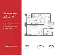 Однокомнатная квартира в Клубный квартал "Ассамблея" на 9 этаже. Квартира без отделки, полностью готова к ремонту. Общая площадь: 41.4 кв.м., жилая: 14.93 кв.м., площадь просторной кухни-столовой: 16 кв.м. Все окна выходят на одну сторону. В квартире одна лоджия, один совмещенный санузел. Высота потолков 3.0 м.