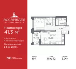 1-комн. квартира в Клубный квартал "Ассамблея" на 11 этаже. Квартира без отделки, новый владелец может сделать ремонт по своему дизайн-проекту. Общая площадь: 41.3 кв.м., жилая: 14.93 кв.м., площадь просторной кухни-столовой: 15.9 кв.м. Все окна выходят на одну сторону. В квартире одна лоджия, один совмещенный санузел. Высота потолков 3.0 м.