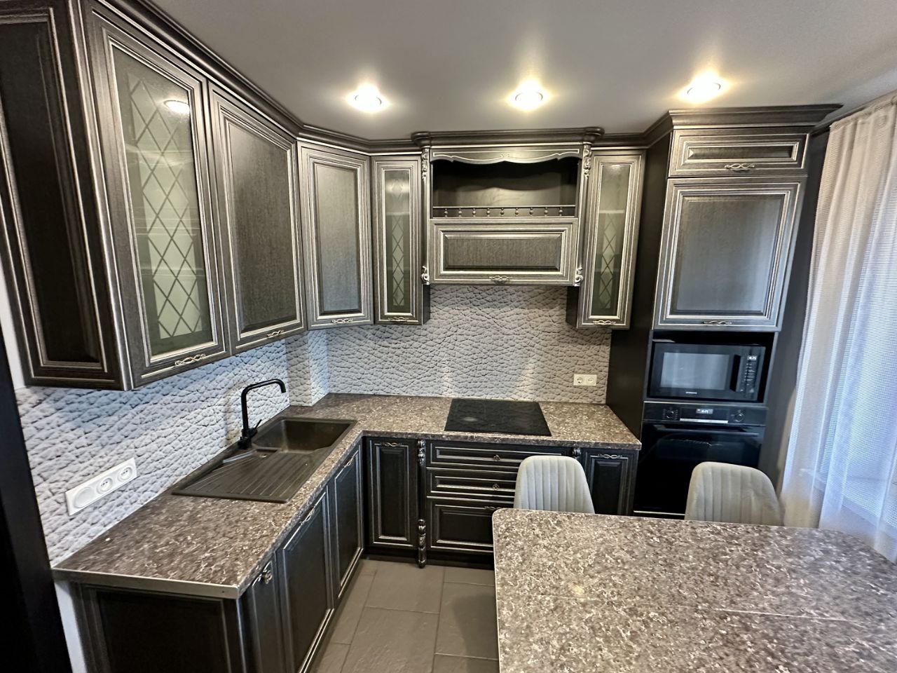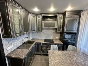 Кухонный гарнитур в классическом стиле, выполненный на заказ в нестандартном цвете, но очень сочетается со всем интерьером квартиры. Кухня оборудована всей техникой: электрическая варочная панель, духовой шкаф, СВЧ и посудомоечная машина. На кухне достаточно комфортно разместился обеденный стол с уникальным подстольем и четырьмя посадочными местами.