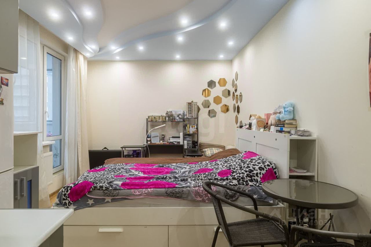 Окна выходят на восток, обеспечивая мягкое утреннее освещение без прямых солнечных лучей. Высота потолков 2,7 м, звукоизоляция соответствует современным стандартам. В квартире предусмотрено разделение на зоны: кухонный блок, спальное место и компактная гардеробная. Теплоснабжение и горячее водоснабжение централизованные, установлены счетчики учета воды и электроэнергии.